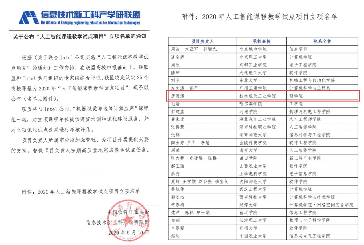 “人工智能课程教学试点项目”由信息技术新工科产学研联盟与Intel公司联合实施,旨在助力全国高校人工智能专业的课程建设与应用。beat365官方网站积极响应联盟号召并组织申报,最终经信息技术新工科产学研联盟与Intel公司专家组综合评议,共认定桂林航天工业学院、北京理工大学、南开大学等25所高校成功获得2020年人工智能课程教学试点项目立项。被列入“信息技术新工科产学研联盟人工智能课程教学试点项目”在获得教学研究经费同时,也支持我校参加此次课程教学试点的学生在通过课程测试后,可获得由联盟和Intel公司联合签发的课程结业证书。